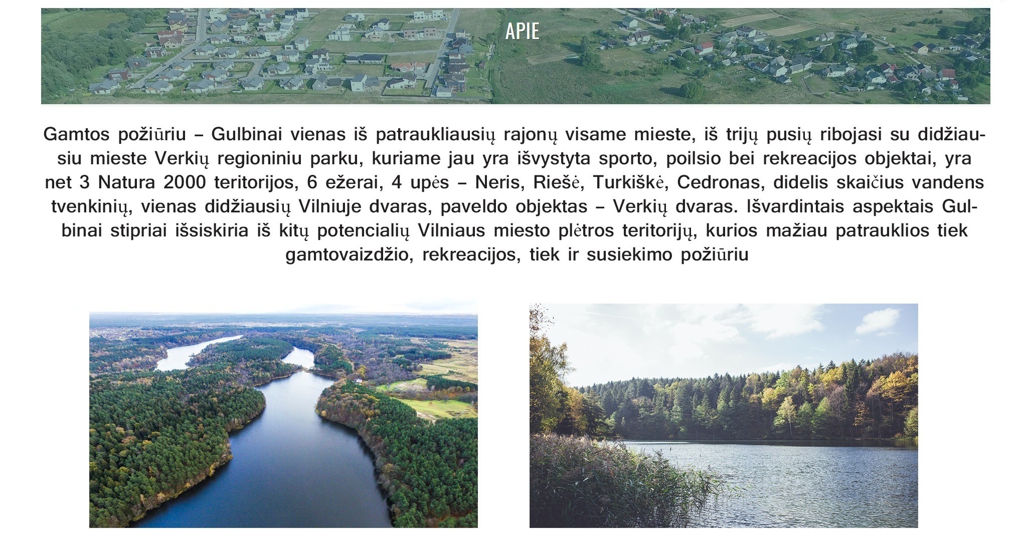 Gamtos požiūriu – Gulbinai vienas iš patraukliausių rajonų visame mieste, iš trijų pusių ribojasi su didžiausiu mieste Verkių regioniniu parku, kuriame jau yra išvystyta sporto, poilsio bei rekreacijos objektai, yra net 3 Natura 2000 teritorijos, 6 ežerai, 4 upės – Neris, Riešė, Turkiškė, Cedronas, didelis skaičius vandens tvenkinių, vienas didžiausių Vilniuje dvaras, paveldo objektas – Verkių dvaras. Išvardintais aspektais Gulbinai stipriai išsiskiria iš kitų potencialių Vilniaus miesto plėtros teritorijų, kurios mažiau patrauklios tiek gamtovaizdžio, rekreacijos, tiek ir susiekimo požiūriu. Planuojamas gyventojų skaičius – 10 000 gyventojų.