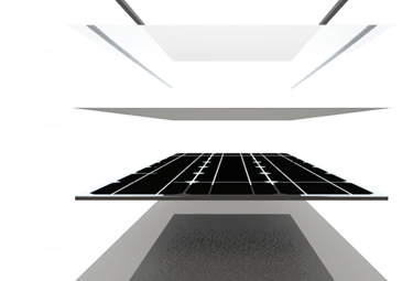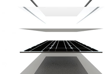 Saulės skydas sudarytas iš silicio saulės elementų, įterptų tarp dviejų stiklo sluoksnių ir apsaugotas aliuminio rėmu